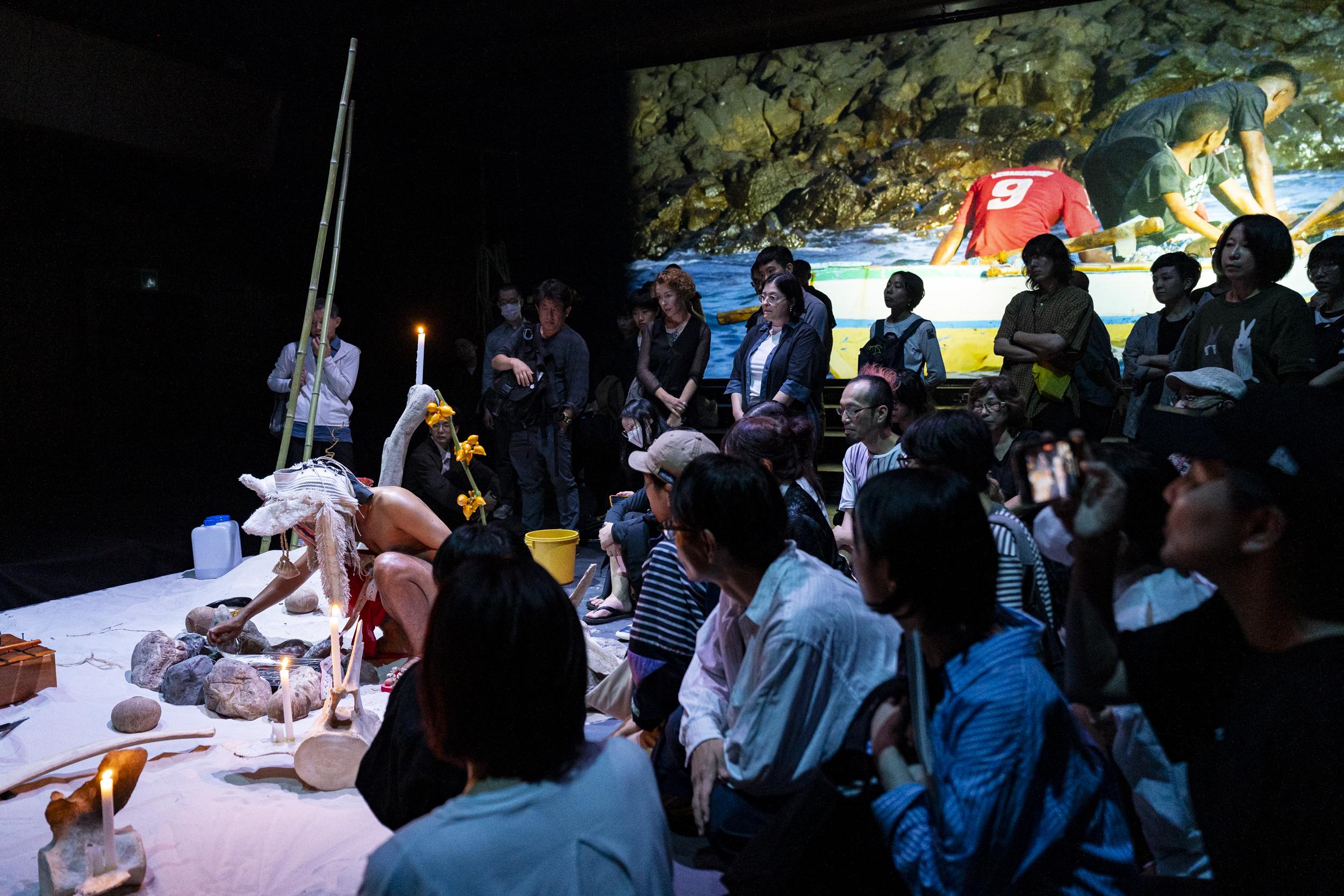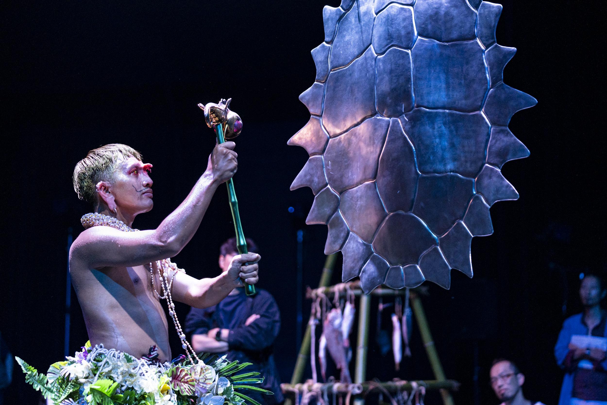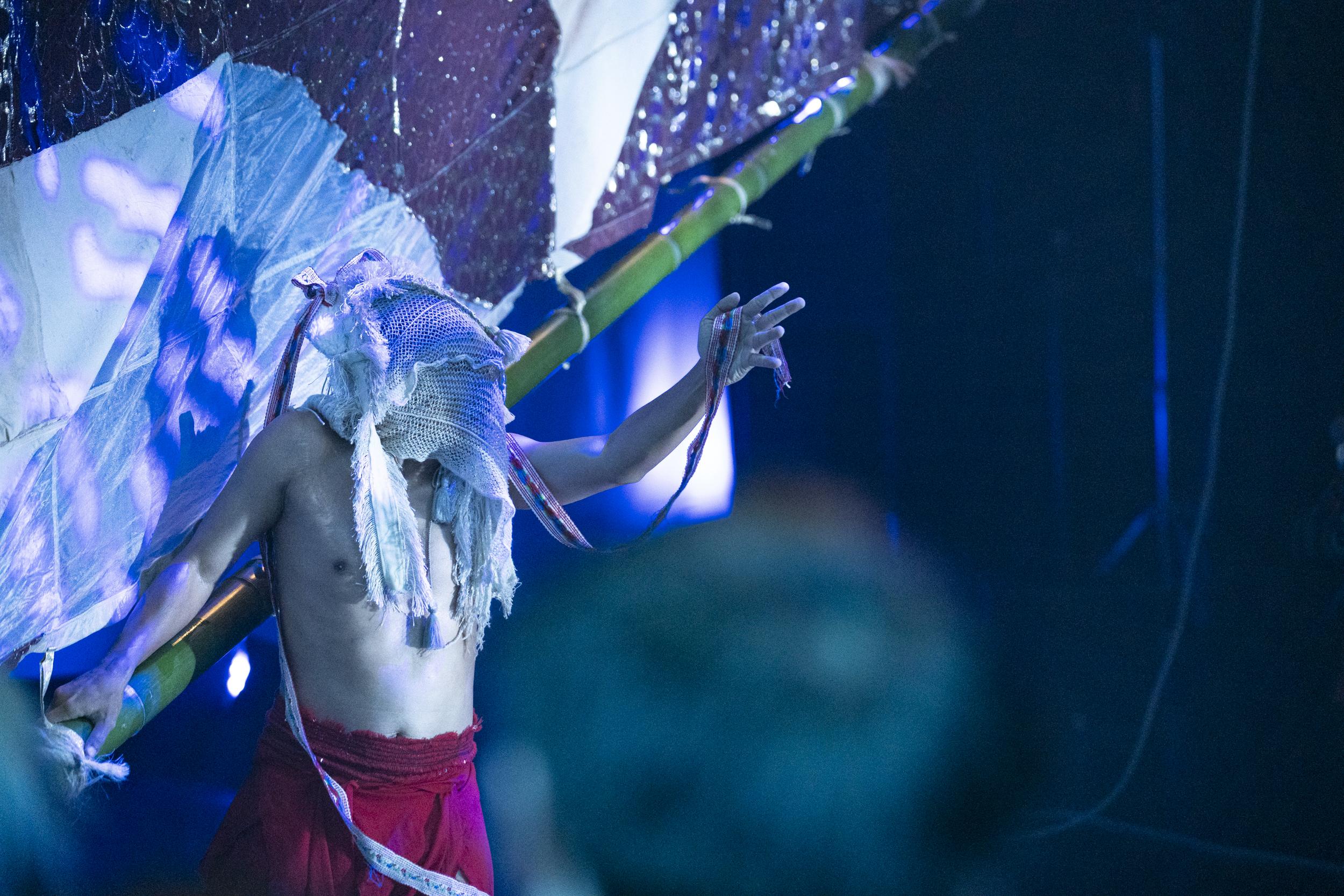 GP: Thank you. It really helps us to understand the cultural depth that is behind the work. And I think one of the striking things about Ocean Cage is how it combines so many forms, dance, installation, film and live music. So I wanted to ask you, Siko, your body is really at the centre of the performance, and you embody these ancestors, these mythical figures. So can you share what it was like preparing for those transformations and how you approach the physical and also the emotional demands of the piece?