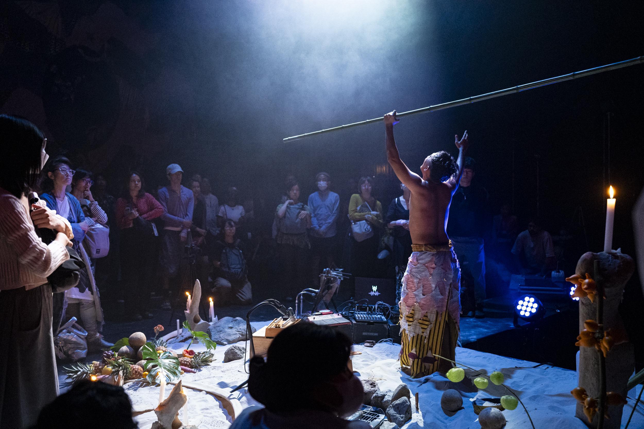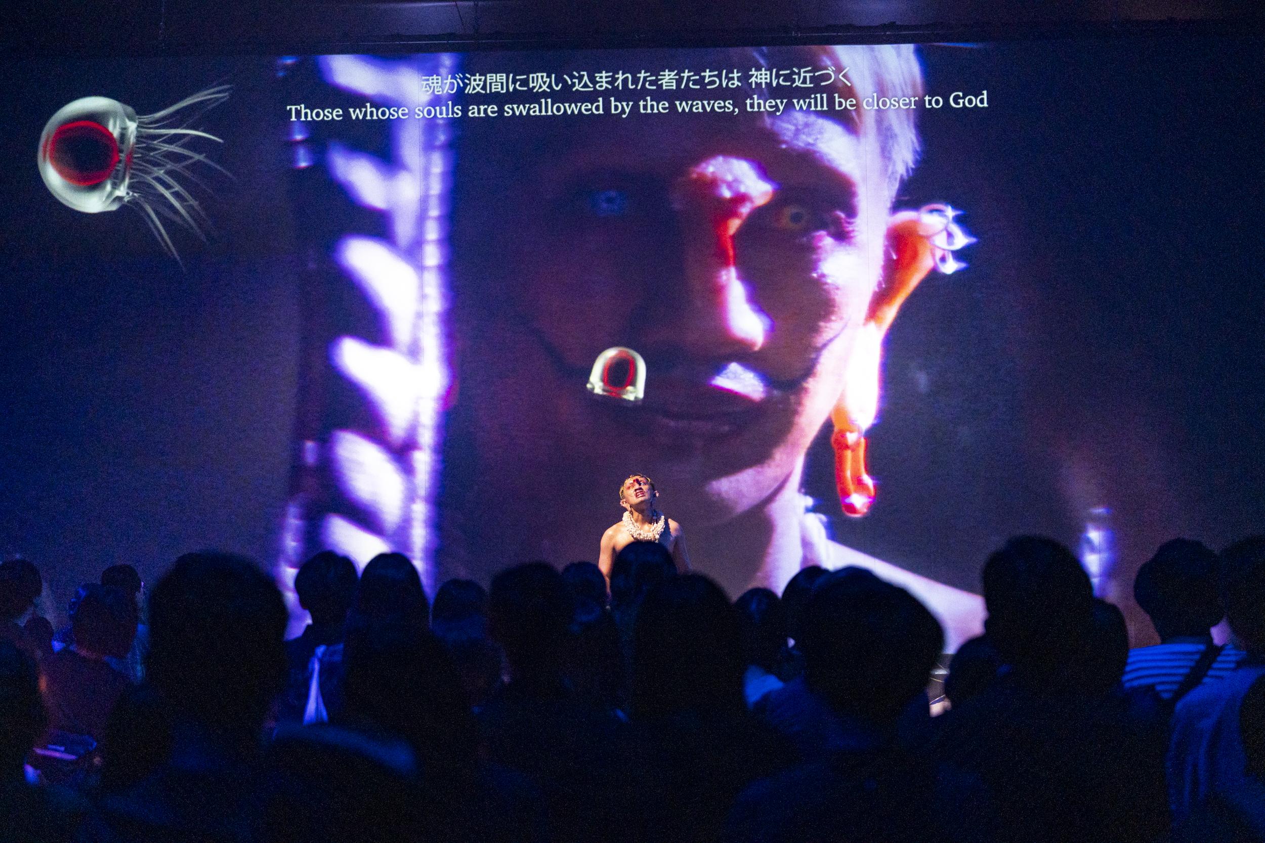 SS: Yeah, I consider the audiences to be a very important partner when we perform because for me they are the, the most important in this performance because sometimes they become a ocean, sometimes they become peoples, sometimes they become- anything. Sometimes they become like an obstacle, sometimes they become- anything. That’s my brain. Like Tianzhuo said every stage is always different. Every, I mean country with their own behaviour is different, which is so beautiful. It means in the middle of performance. I still keep learning, keep studying. And me as a performer, I have a strong discipline to handle it. I will not like lose focus for even one second. That’s why, wow, it’s even, I mean, I’m loose in the choreography, non-choreography, like very tight choreography, but the choreography itself is how I work together with the audience, because in my brain and my body, everything I should pay attention with my musicians because they play music together with me and all my backstage friends. Also the video, I should pay attention, because everything is connected. So yeah, it’s similar, I mean similar like in traditional ritual in Indonesia, everything is, should be like, you know, one. Centre, something like that.