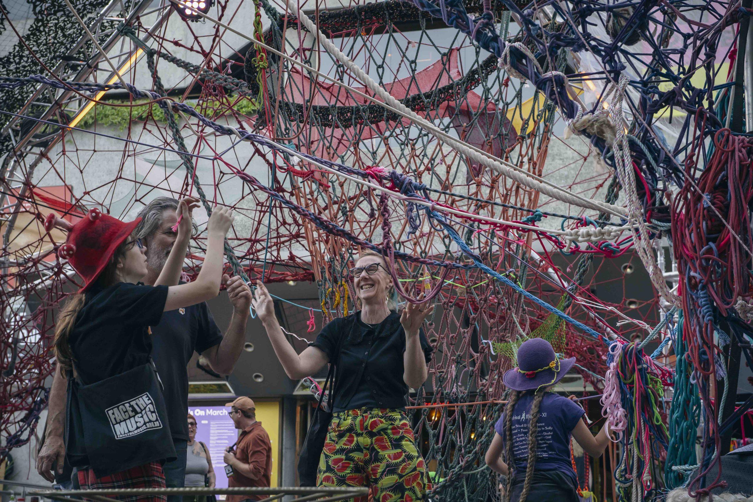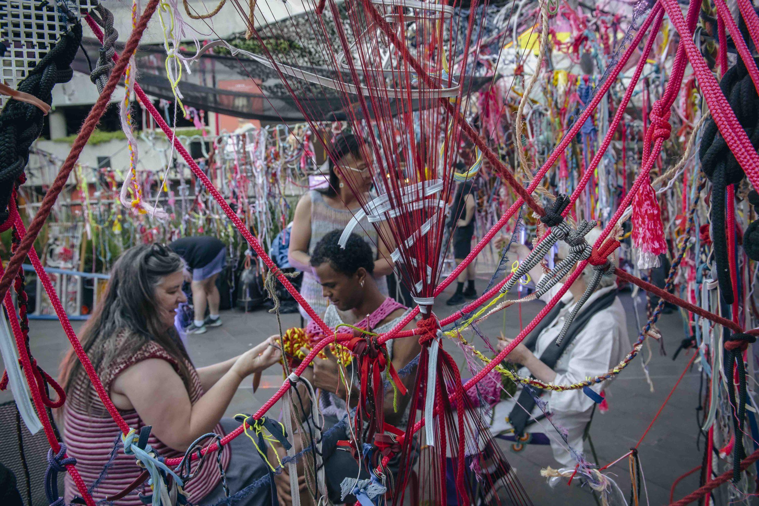 In Home Bound, diverse rope materials and practices are woven together to form a massive social tapestry. Members of different communities — knitters, scouts, shibari practitioners — who don’t usually share the same space collaborate to build a giant rope installation.
