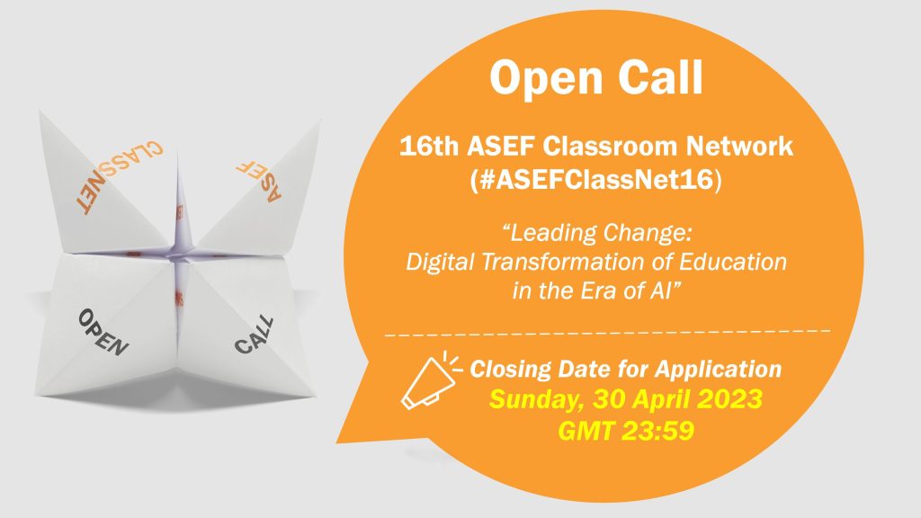 We are pleased to announce the Open Call for the 16th ASEF Classroom Network (#ASEFClassNet16) School Collaboration (Stage 1- Virtual Capacity Building)!