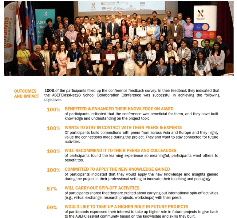 For over two decades, the ASEF Classroom Network has been providing collaborative capacity-building opportunities to secondary, high, and vocational schools in Asia and Europe. It explores the potential of cutting-edge EdTech tools through integration of contemporary education topics such as ESD, CCE, and GCE. in Its target group is broad, given its intergenerational & multi-stakeholder outreach. It ranges from students, teachers, school leaders, teacher trainers, researchers, policymakers, and to EdTech experts. Since its inception, more than 3,000 teachers from Asia and Europe have participated in various activities and become members of the ASEF Classroom Network. As a result, more than 40,000 students have been engaged in 430 Asia-Europe School Collaborations and local spin-off activities. Since 2022, the project also empowered teachers to design over 140 Innovative Teaching Practices that contribute to advancing the quality of education across secondary and vocational schools in Asia and Europe.ASEFClassNet19 Topic: Future-Ready Teaching: Human Agency in the Age of AI