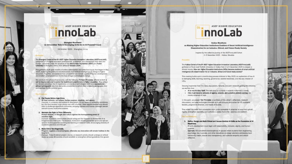 The 6th ASEF Higher Education Innovation Laboratory (ASEFInnoLab6) conference series brought together diverse voices from Asia and Europe to explore how universities can navigate the rapid evolution of artificial intelligence (AI). True to this, we are proud to share that our events in China and Slovakia gave their cohorts of experts, academics, and researchers the opportunity to co-develop complementary manifestos that reflect a shared commitment to shaping AI in ways that remain grounded in human values.