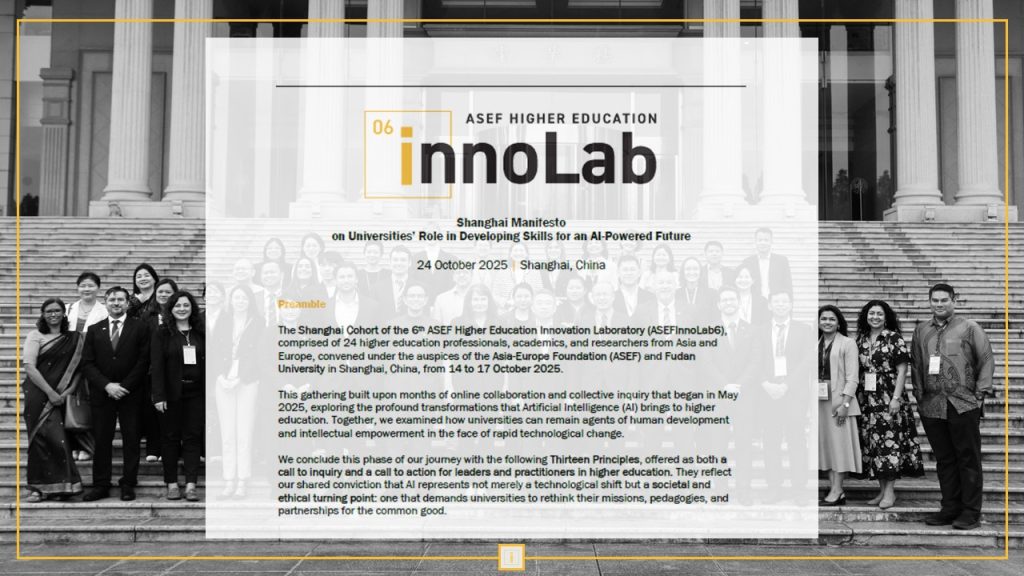 At the 6th ASEF Higher Education Innovation Laboratory (ASEFInnoLab6) Conference convened at Fudan University in Shanghai from 14-17 October 2025, our cohort articulated the powerful Shanghai Manifesto on Universities’ Role in Developing Skills for an AI-Powered Future.