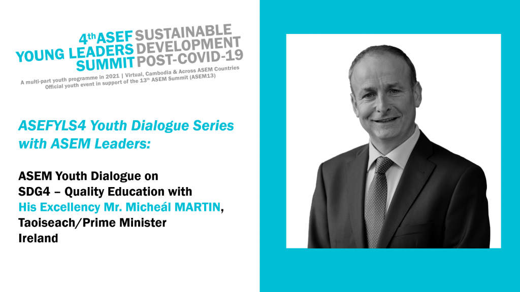 On 20 May 2021, we have the honour of welcoming HE Mr Micheál MARTIN, The Taoiseach/Prime Minister of Ireland. Moderated by ASEFYLS4 youth representatives, this second ASEM Youth Dialogue will focus on SDG4 (Quality Education). If you wish to join, please register below by Tuesday, 18 May, 23:59 UTC.