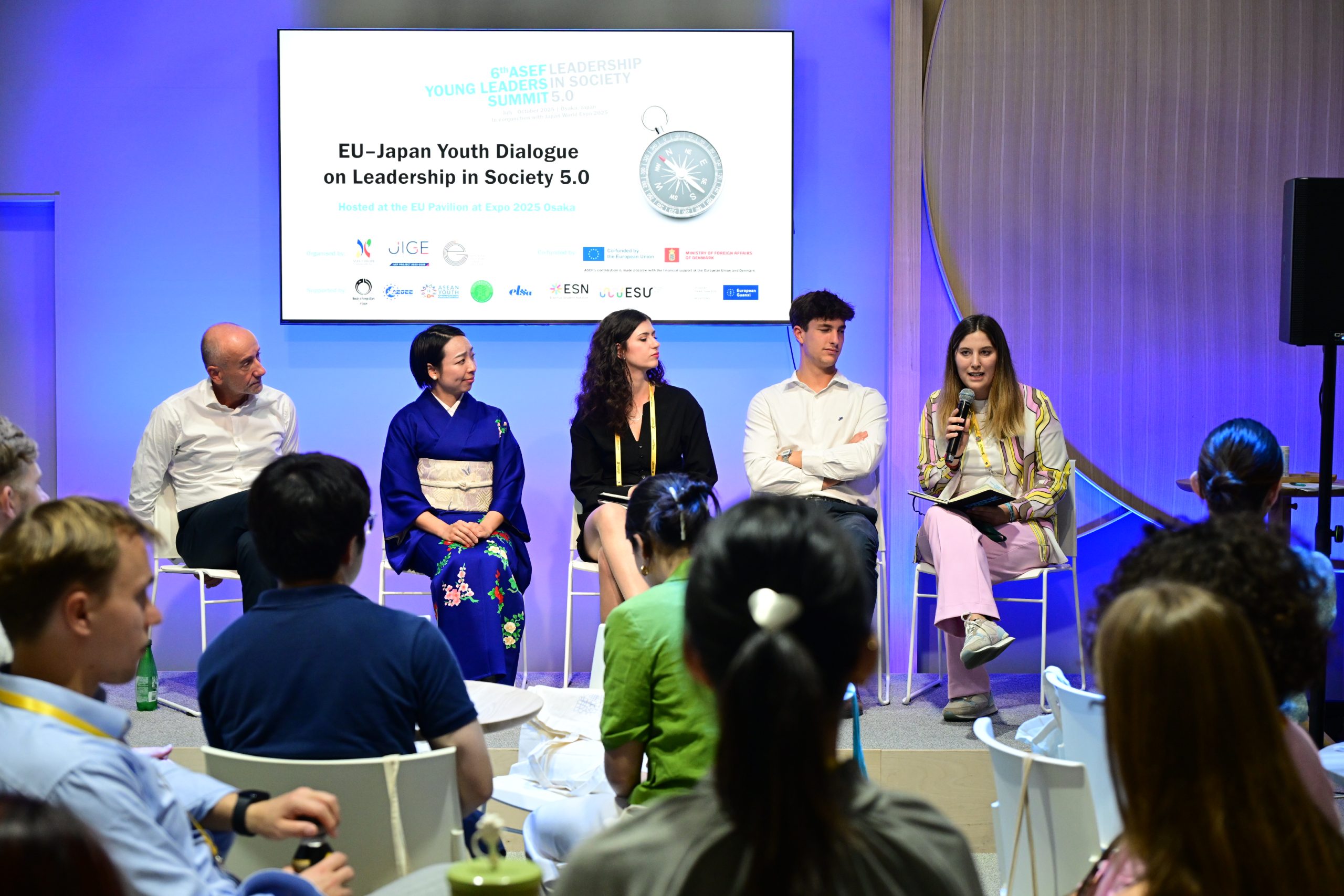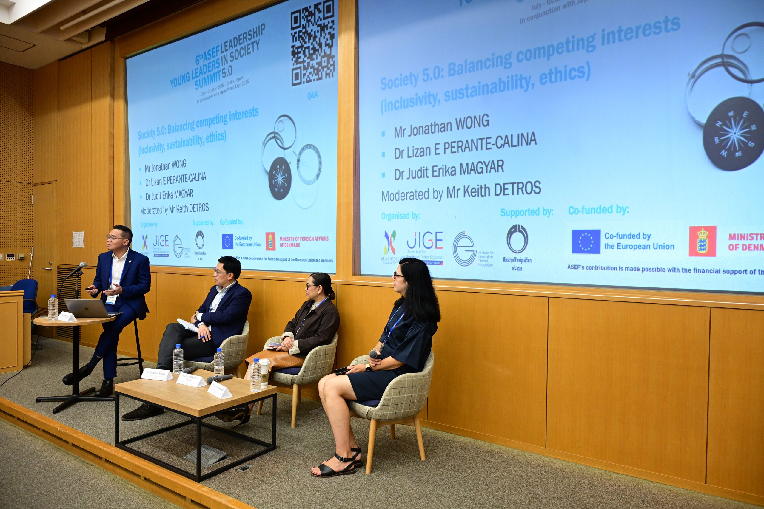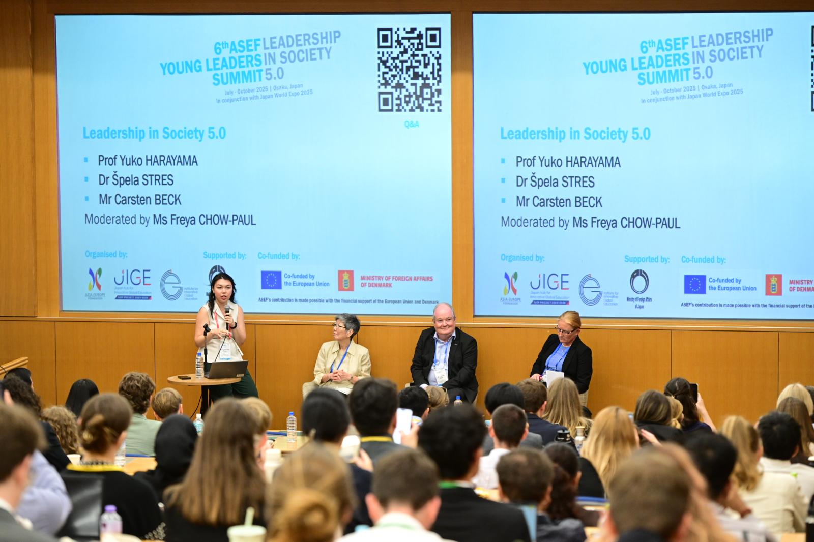 Joining them on stage were ASEFYLS6 young leaders representing Europe through ASEF’s networks: Ms Petra Gombár from Hungary, President of AEGEE-Europe (European Students’ Forum); Ms Sara Tagliabracci from Italy, Global Mobility Coordinator at the Erasmus Student Network (ESN); and Mr Théo Deswaef from Belgium, Vice-President in charge of Competitions at the European Law Students’ Association (ELSA). Each brought forward perspectives from their respective fields and organisations, enriching the dialogue on youth leadership in shaping Society 5.0.