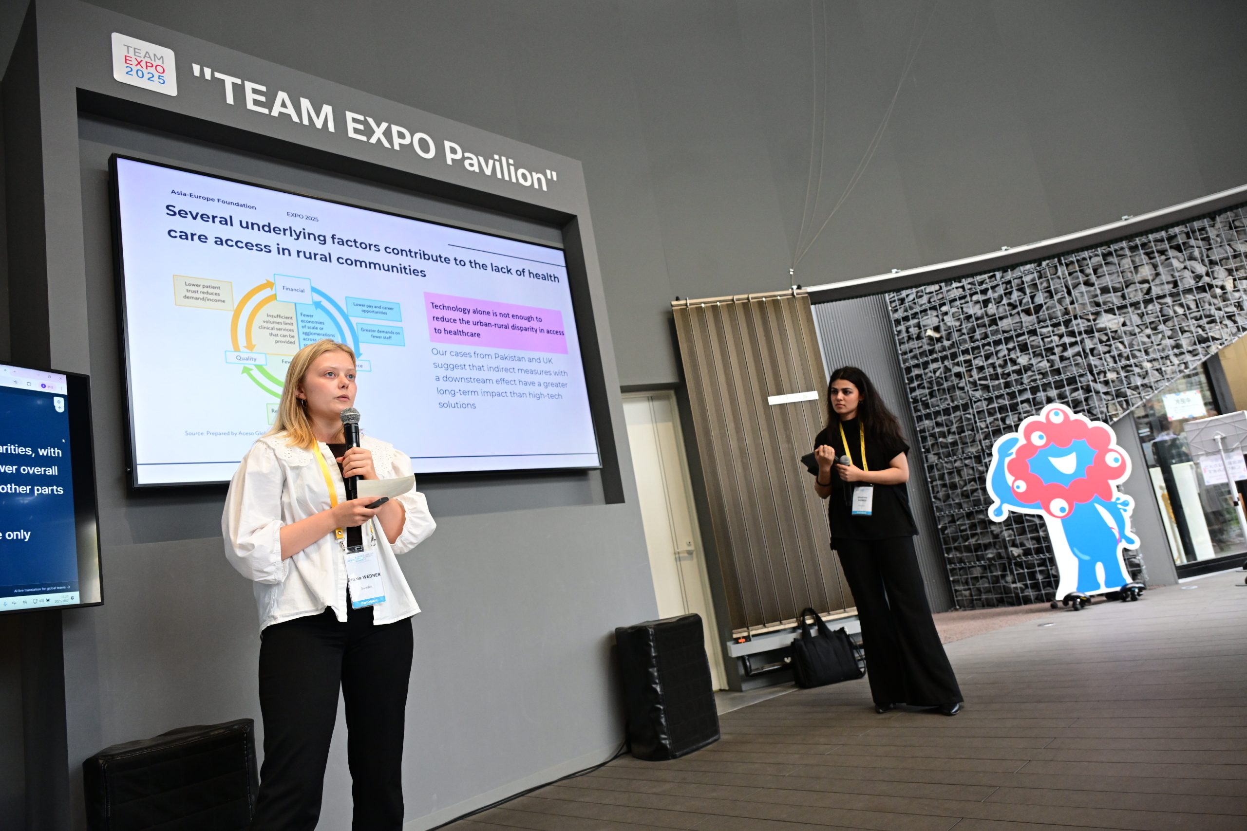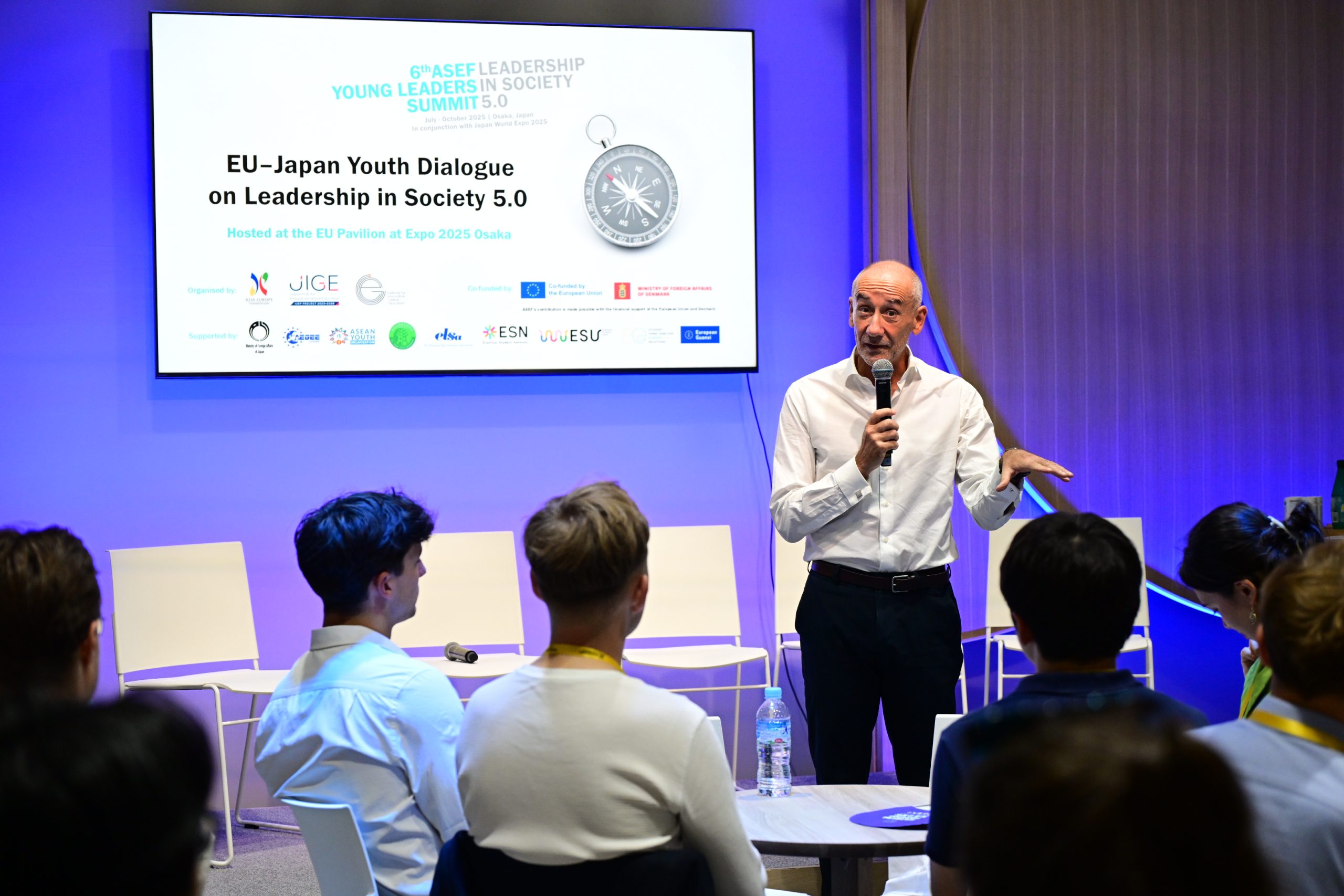 In the afternoon, many gathered at the EU Pavilion for a special session on the EU–Japan Youth Dialogue on Leadership in Society 5.0. The dialogue featured opening contributions from H.E. Jean-Eric Paquet, Ambassador of the European Union to Japan, and Ms Yoko Kitaguchi, Country Representative for Japan of the Erasmus Mundus Association (EMA).