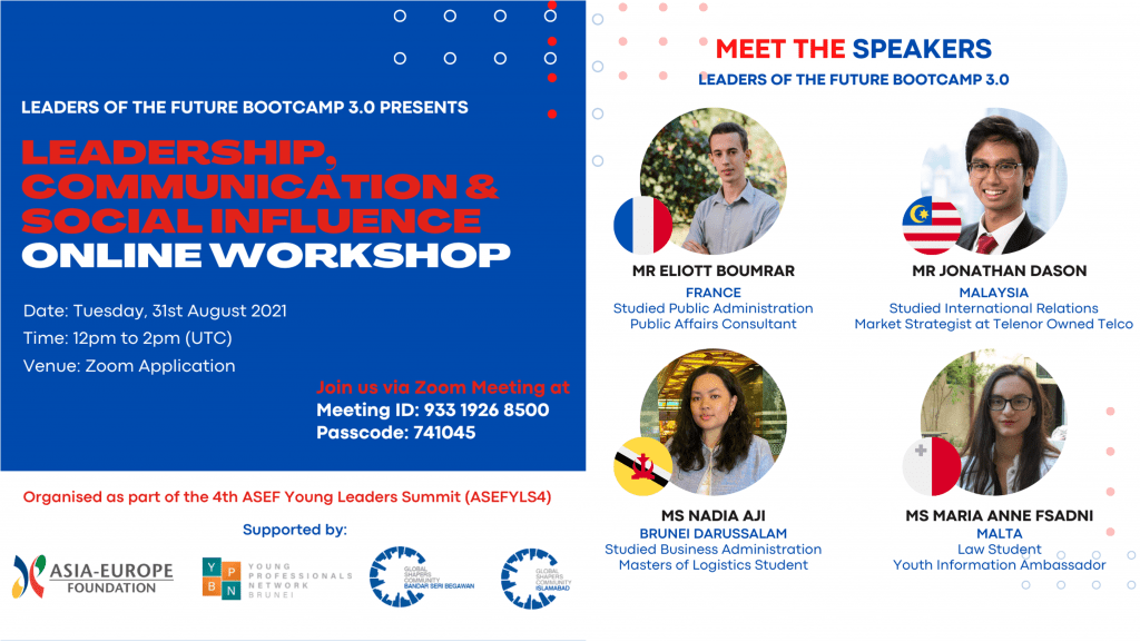 The LFB online workshop on Leadership, Communication & Social Influence” takes place on Tuesday, 31 August 2021, 12pm to 2pm UTC. The workshop will be conducted and facilitated by 4 ASEFYLS4 participants: