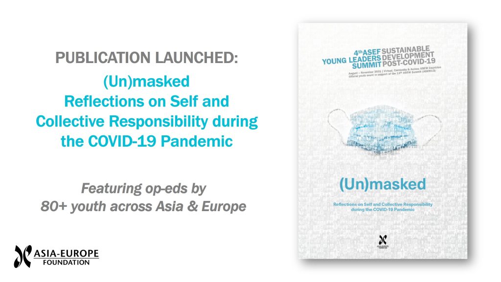 This is the focus of the ASEFYLS4 publication: ‘(Un)masked: Reflections on Self and Collective Responsibility during the COVID-19 Pandemic’, an outcome of the 4th ASEF Young Leaders Summit (ASEFYLS4) on Sustainable Development in a Post-COVID-19 World.