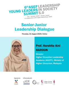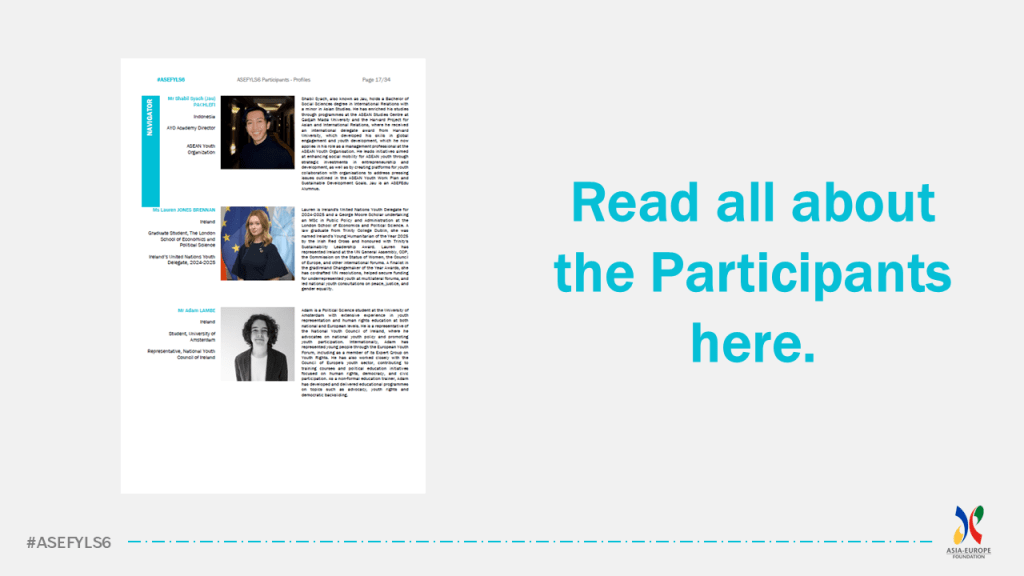 The 6th ASEF Young Leaders Summit (ASEFYLS6) is a youth leadership programme focusing on ‘Leadership in Society 5.0’, with collaborative programme elements taking place both virtually and physically.