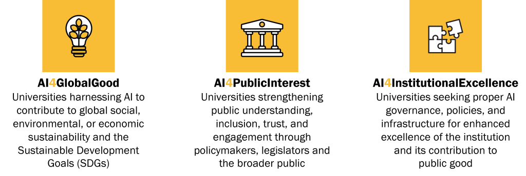 White papers produced through this process will articulate strategic pathways through which higher education institutions can align AI development and deployment with societal needs, ethical principles, and long-term public value. The white papers will address an issue within the three subthemes AI4GlobalGood, AI4PublicInterest, and AI4InstitutionalExcellence.