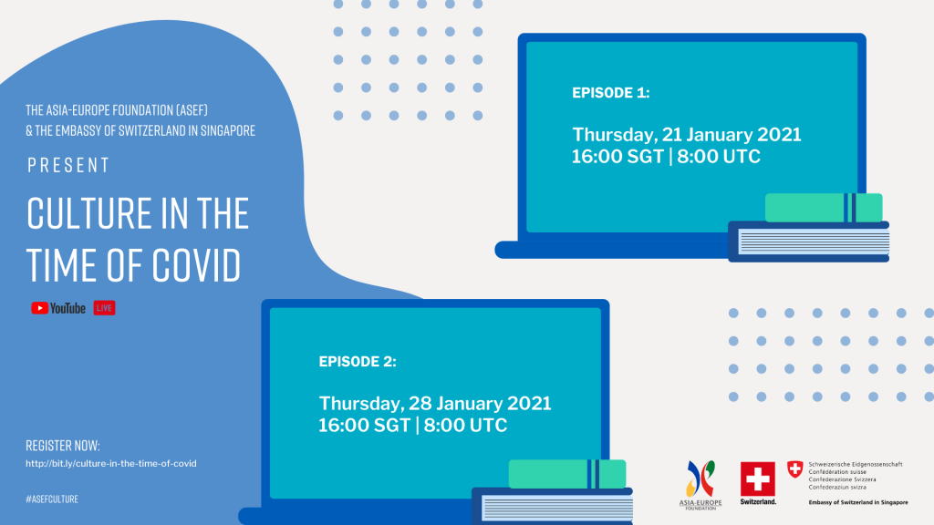 The Asia-Europe Foundation (ASEF) and the Embassy of Switzerland in Singapore jointly presents ‘Culture in the Time of Covid’, a 2-part webinar series that aims to share how arts organisations and public agencies have adapted their programmes in response to Covid-19, and explore how cultural exchange and international collaborations in the arts will look like … Continue reading Webinar series: Culture in the Time of Covid